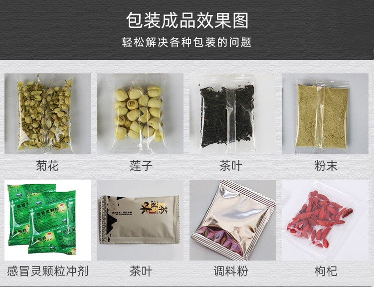 5、智能型温控仪控制。自动完成计量、制袋、充填、封合、打印批号、切断及计数等全部工作。