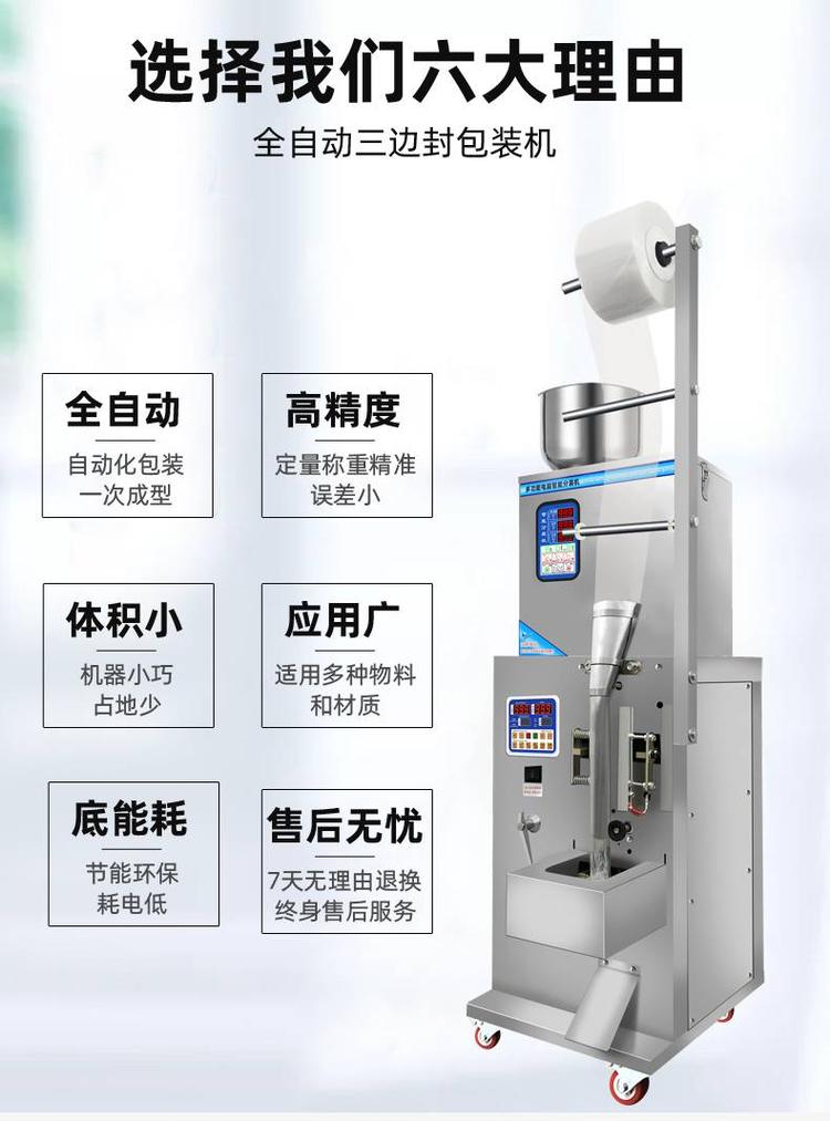 5、智能型温控仪控制。自动完成计量、制袋、充填、封合、打印批号、切断及计数等全部工作。