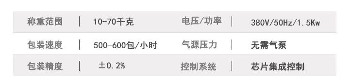 该机在进入自动运行状态后,称重控制系统打开给料门开始加料,该给料装置为大、中、小三级给料方式;当物料重量达到快给料设定值时,停止快给料,保持慢给料;当物料重量达到最终设定值时,关闭给料门,完成动态称重过程;此时系统检测夹袋装置是否处于预定状态,当包装袋已夹紧后,系统发出控制信号打开称量斗卸料门,物料进入包装袋中,物料放完后自动关闭称量斗的卸料门;卸空物料后松开夹袋装置,包装袋自动落下;包装袋落下后进行缝包并输送到下一工位。如此循环往复自动运行。
