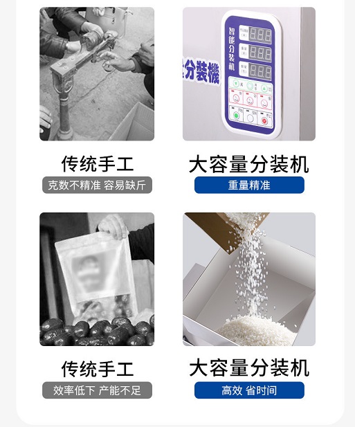 5、微电脑主板更加耐用节能,速度快,误差小,性能高,可灌装,袋装,一分钟25包左右视不同物品,