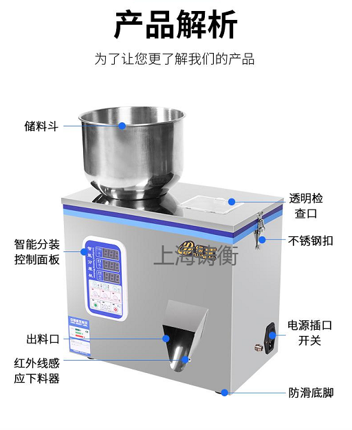 上海铸衡工厂生产的这台颗粒分装机可以根据用户物料需求快中慢三速调节,提高了顾客包装效益,节省了人工称重时间,提高了产品包装数量。购买分装机的五大优点,科技,节能,高品质,价格优惠。分装机适用于大米,谷物,药材,茶叶,干货,零件,水果,调味料,种子,粉状物,化肥等一般的非粘性固体物料。